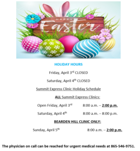 Our office will be closed on Saturday, July 2nd, and Monday, July 4th, in observance of the July 4th holiday. For urgent after hours needs, our call center can be reached at 865-546-9751. Summit Express Clinic schedules can be found